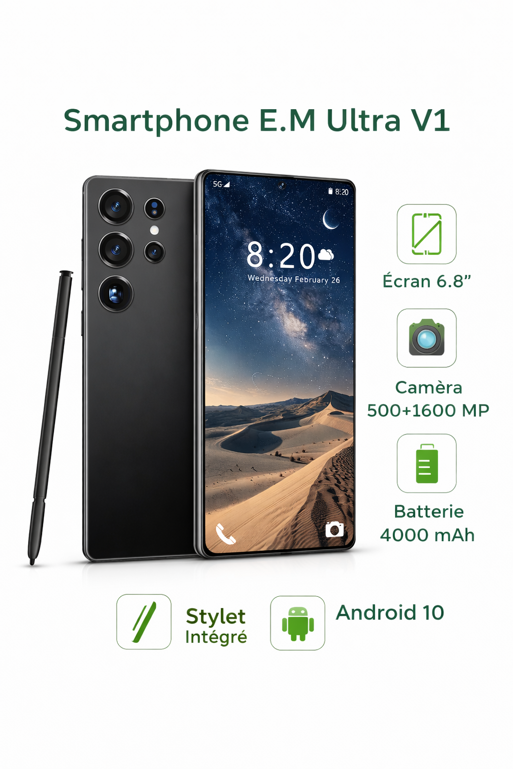 Avec son grand écran 6,75″, son design raffiné et son processeur fluide sous Android 10, le E.M Ultra V1 offre une expérience rapide et agréable. Profitez d’un système photo avancé, d’une autonomie longue durée et de la 4G pour rester connecté partout. Le smartphone parfait pour ceux qui veulent du style sans compromis sur la performance.